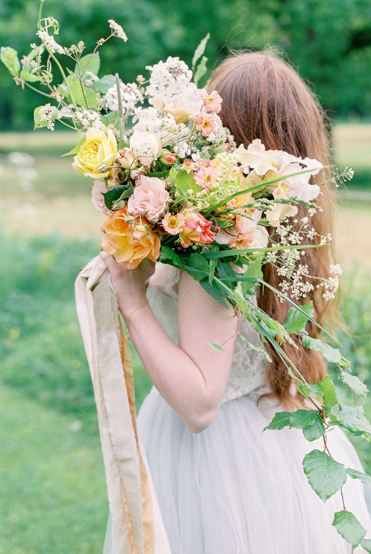 Liz says of the shoot; “Captured on film deep in the Somerset countryside, this bridal inspiration features a striking redhead bride, wild seasonal florals, botanical elements and gold accents. Our table styling and colour palette of muted greens, earthy browns and blush, creams and gold would equally suit an Autumn wedding as a Spring one for a classic, versatile look. We wanted to achieve a wild, natural, even rustic look, without sacrificing taste and elegance.”