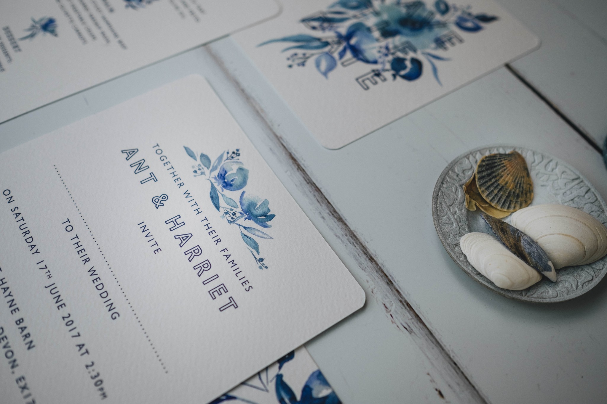 This is a particularly special suite as it is actually the design I created for my own wedding! I have long been in love with delftware blue and white plate designs. The classic suite features a number of woodland animals and fantastical plants. There is the tiniest accent of amber in the fruit on the vines to create a lovely complimentary contrast to the elegant suite. With curved corners and details everywhere you turn, this is a wedding invitation suite full of beautiful hand painted illustrations.