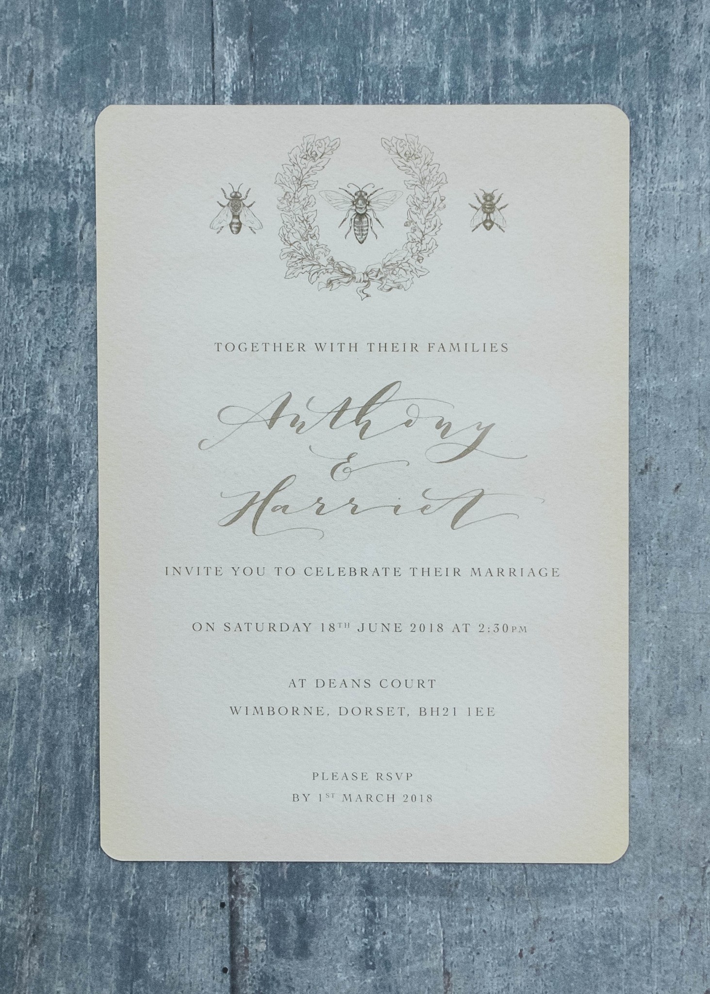 I have been drawing bees for as long as I can remember. In the Romantic collection, the Queen Bee wedding invitation features my pen and ink illustrations of three types of bee: Drone Bee, Worker Bee, and of course, the Queen. She sits in the centre bedecked by an acorn wreath.