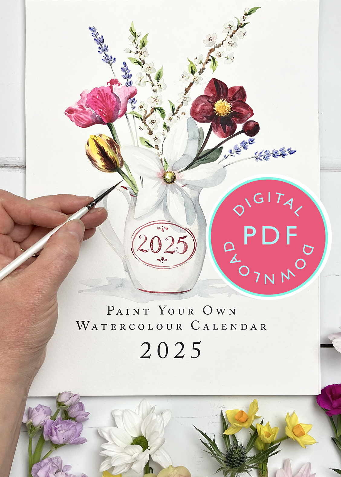 Learn to paint beautiful watercolour flower arrangements throughout 2025, with brand new, exclusive tutorials from Harriet de Winton on a private Youtube playlist. This Paint Your Own Calendar Digital Download is perfect for anyone who wants to paint beautiful watercolour flowers.