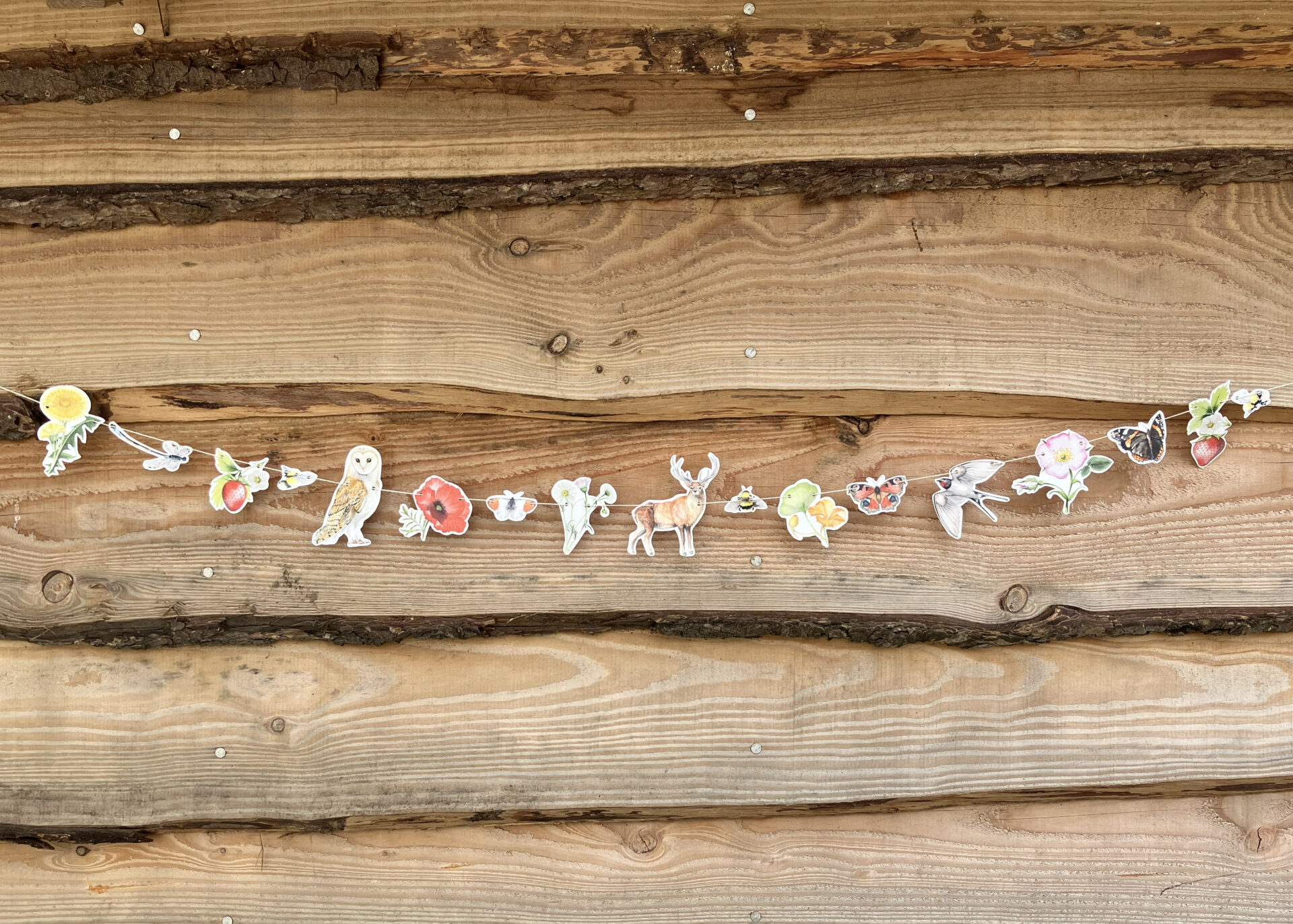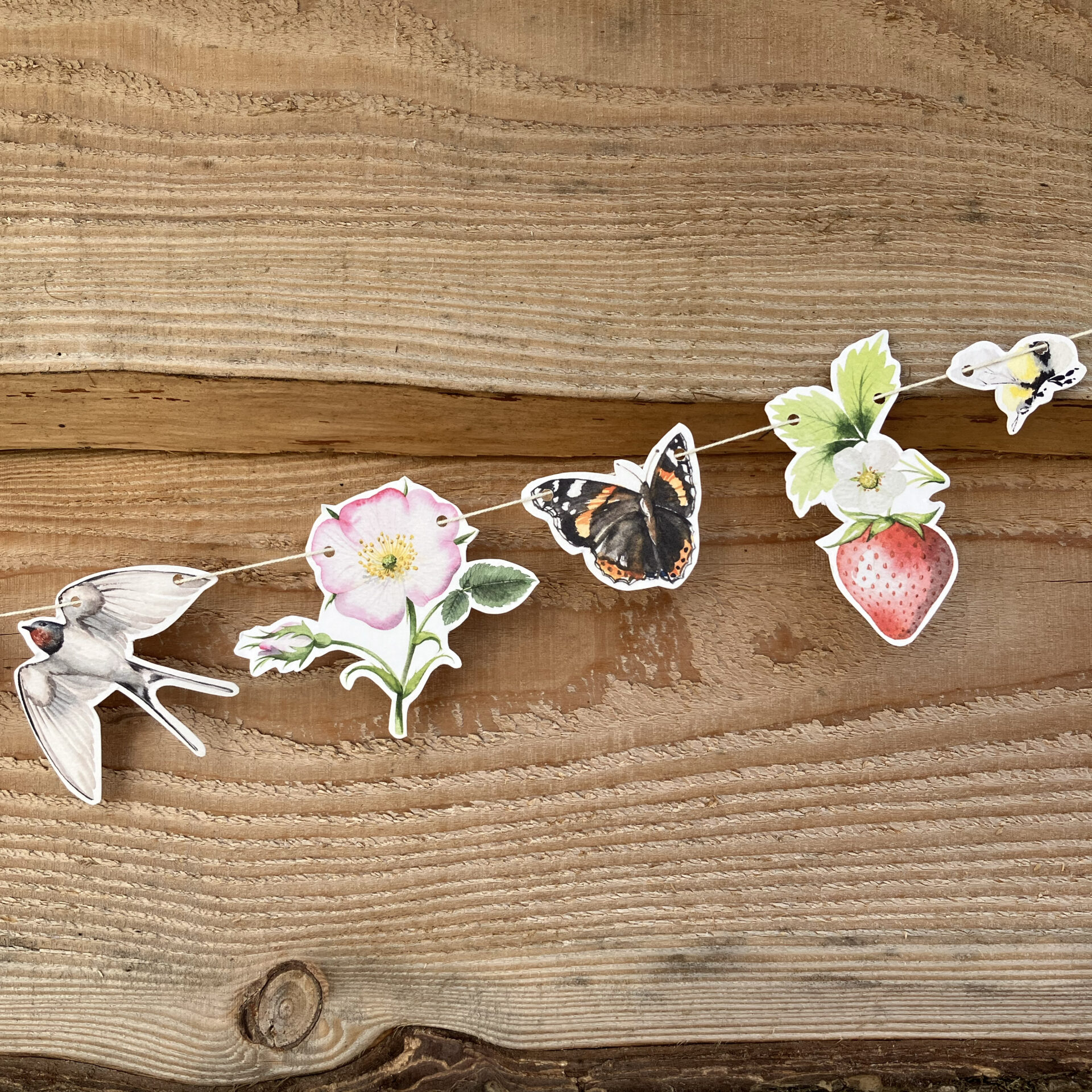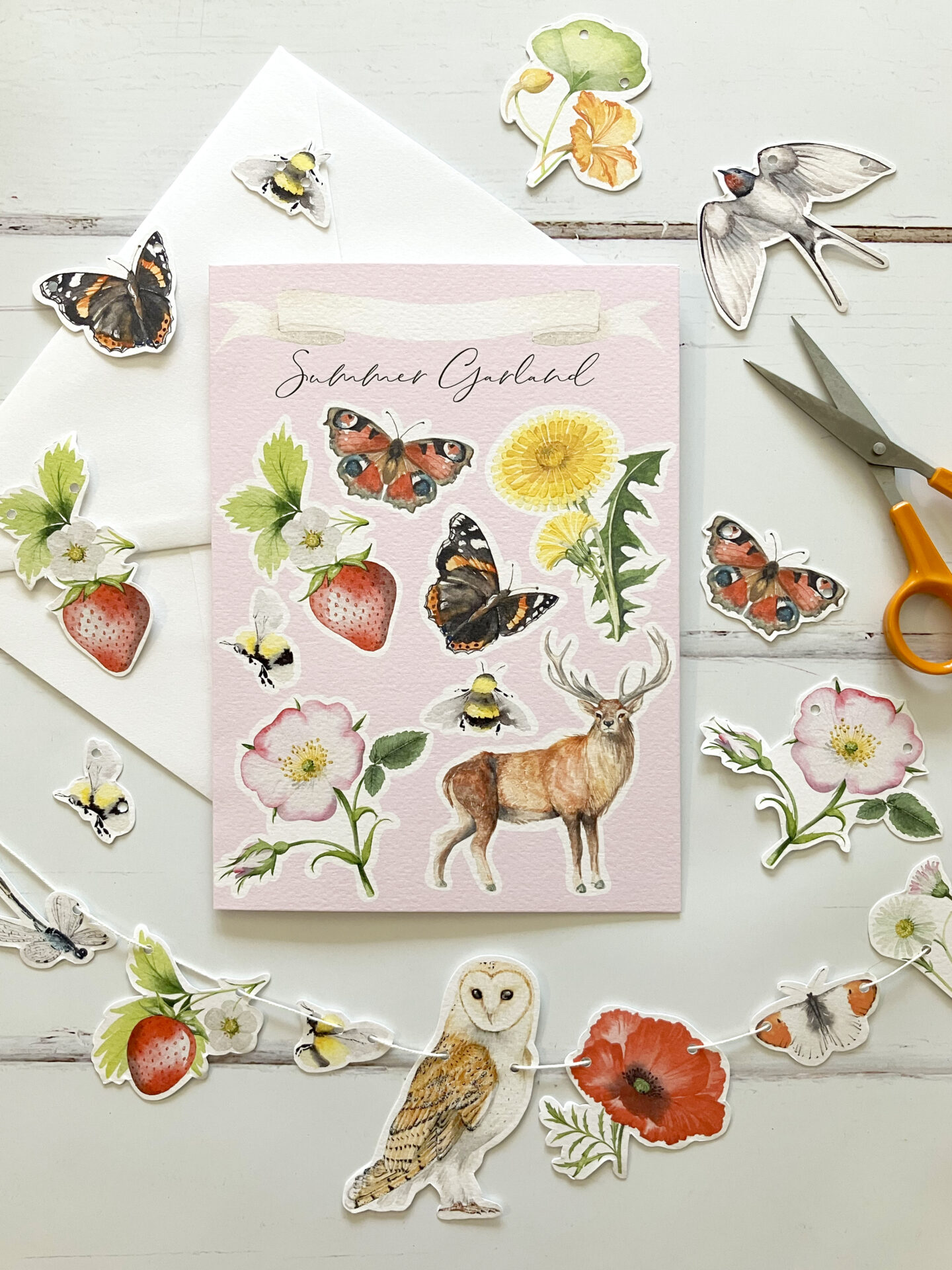 This printable personalised greetings card makes a beautiful craft gift! You can personalise the watercolour banner at the top of the card yourself! The Summer Garland card features Harriet’s hand painted watercolour illustrations that can be cut out (with adult supervision), holes punched and threaded along a string to make a delightful Summer garland.