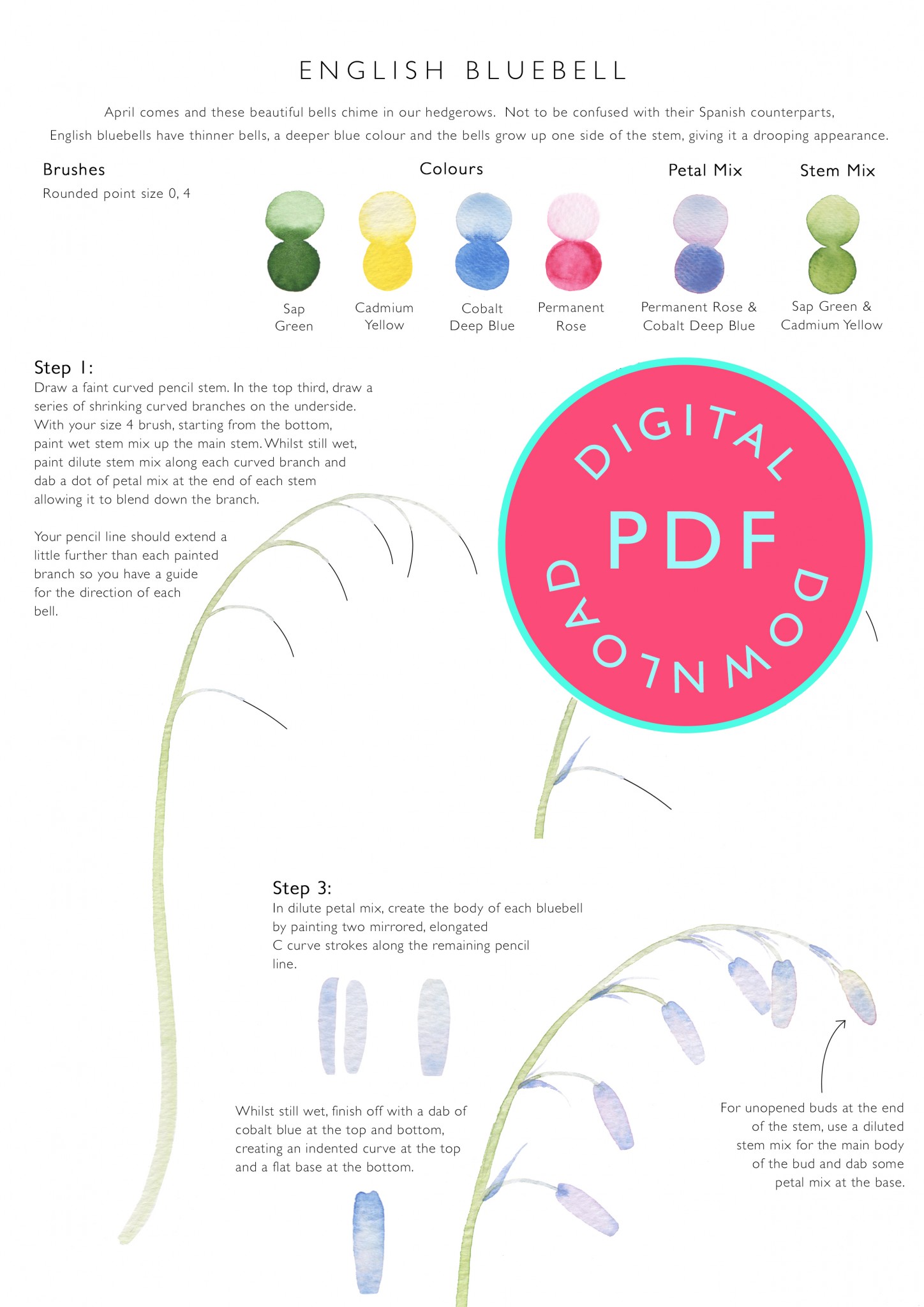Learn to paint an English Bluebell in my new botanical watercolour style with this downloadable PDF. The perfect accompaniment to a watercolour kit.