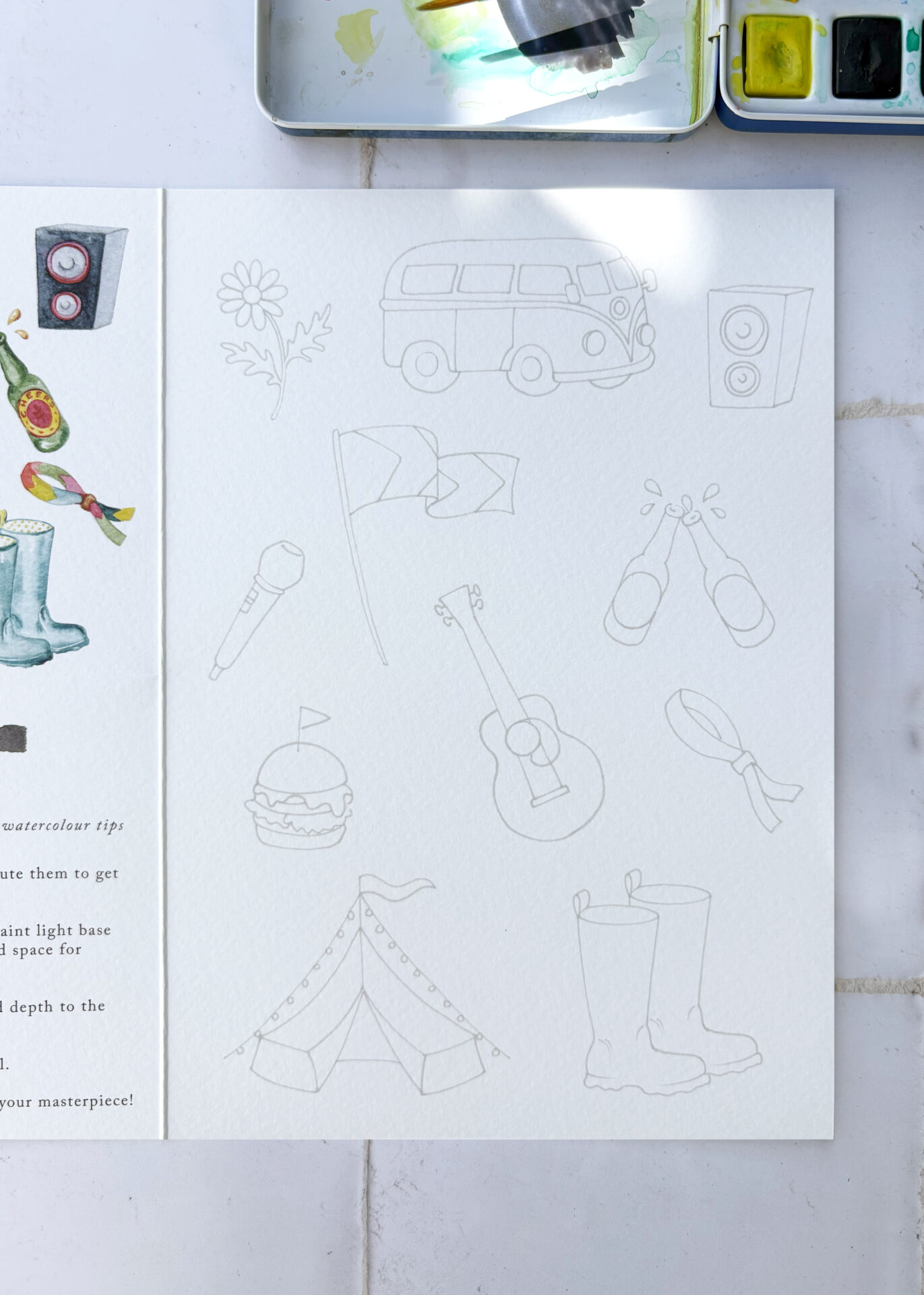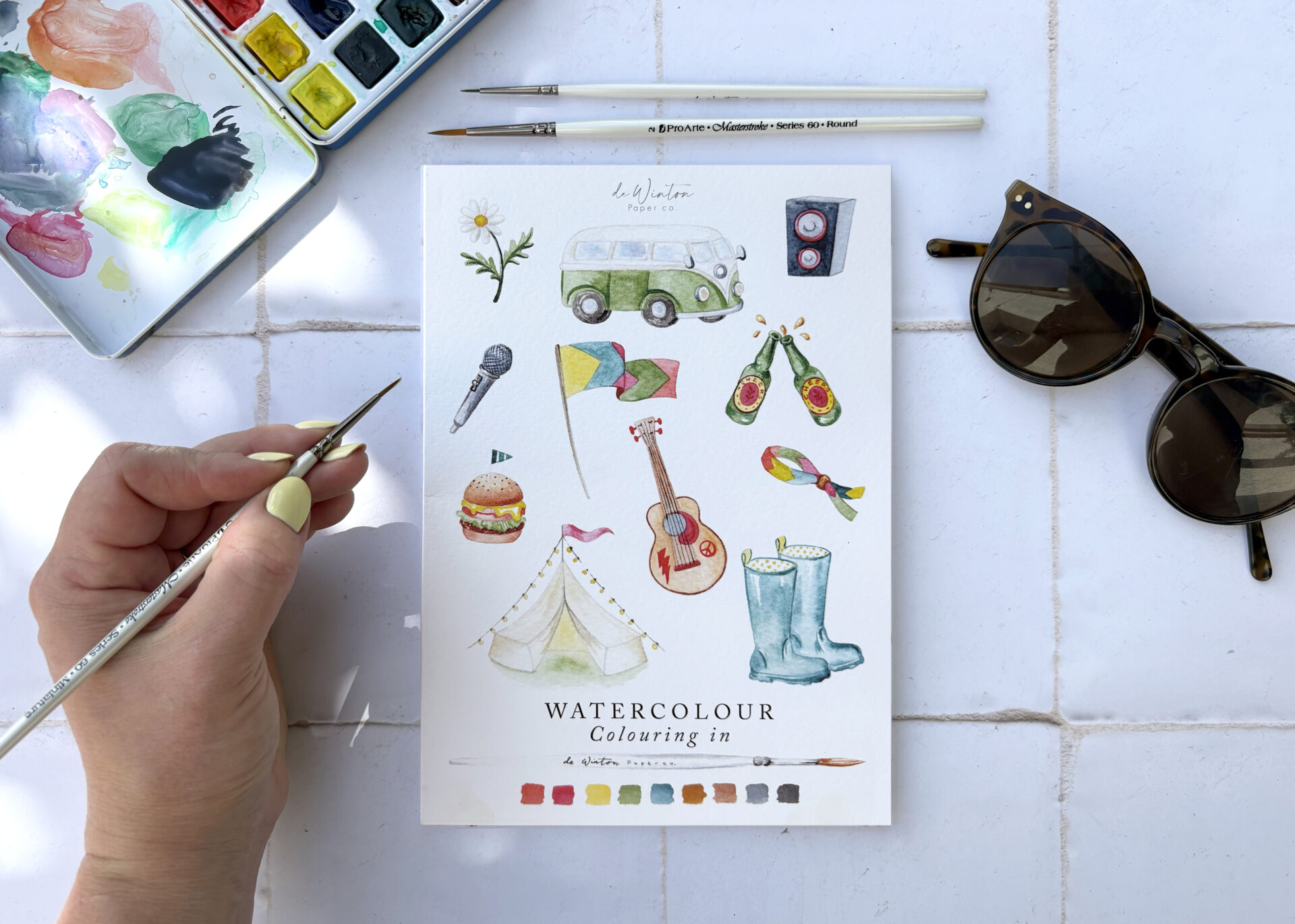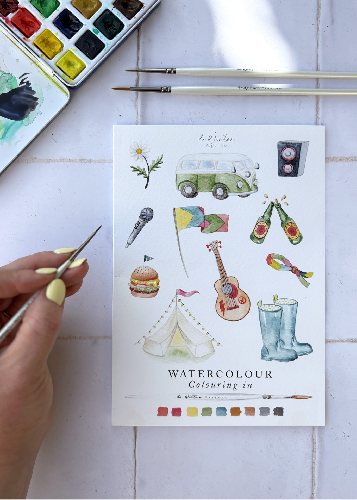 **Digital Product** Bring the spirit of celebration to life with Festival Colours, a vibrant watercolour colouring booklet for you to print off at home filled with 11 beginner-friendly illustrations inspired by festivals around the world. From twinkling string lights and food stalls to tents, guitars, daisies, and welly boots, each picture captures the fun, energy, and magic of festival moments.